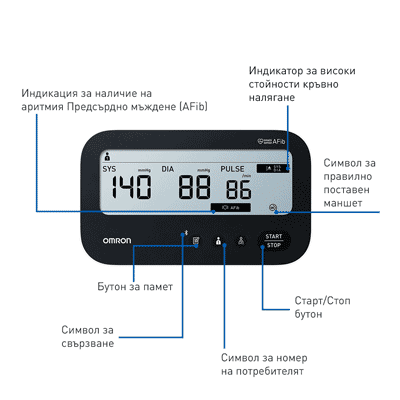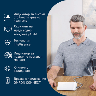 - Bluetooth връзка и OMRON CONNECT приложение