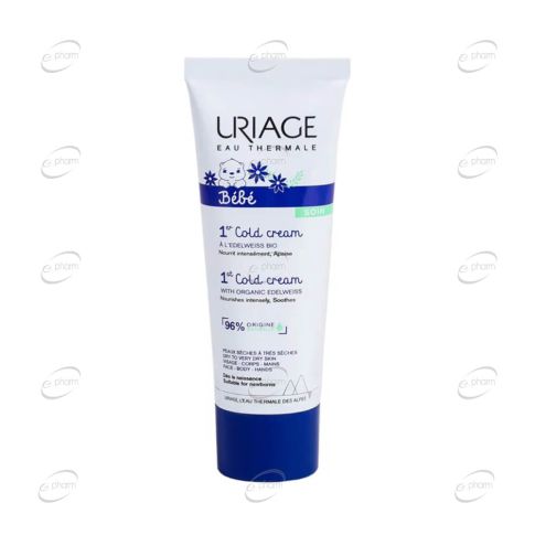 Uriage Bébé 1er Cold Cream е подхранващ крем за лице, създаден специално за нежната бебешка кожа от първия ден след раждането. Със своята хипоалергенна формула, обогатена с органичен еделвайс, растителен сквалан и термална вода Uriage, кремът осигурява ефективна защита от агресивни външни влияния като студ и вятър. Той създава защитен филм, който предпазва кожата от прекомерно изсушаване, като я подхранва и успокоява в дълбочина.